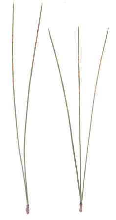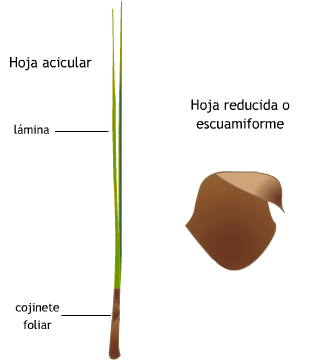 y terminan en 1-5 hojas aciculares. Cada hoja acicular tiene dos
